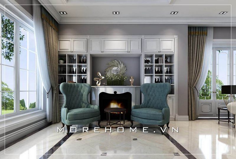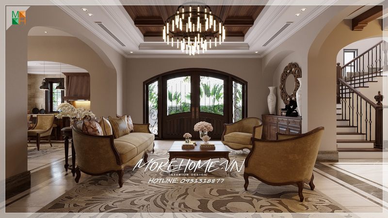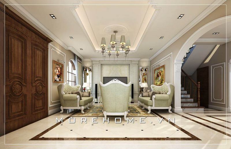 Phòng khách biệt thự theo phong cách tân cổ điển sự dụng hoa văn tròn làm điểm nhấn