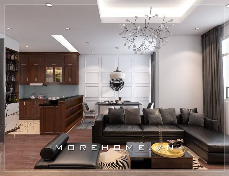 Thiết kế nội thất phòng khách liền bếp cho căn hộ chung cư sẽ là giải pháp "đánh lừa" cảm giác không gian được nới rộng rất hữu hiệu.
