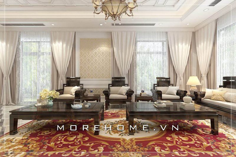 Thiết kế sofa phong cách tân cổ điển uốn lượn nghệ thuật với khung gỗ óc chó cao cấp nổi bật trong không gian thoáng đãng, trong suốt của phòng khách chung cư, nhà phố
