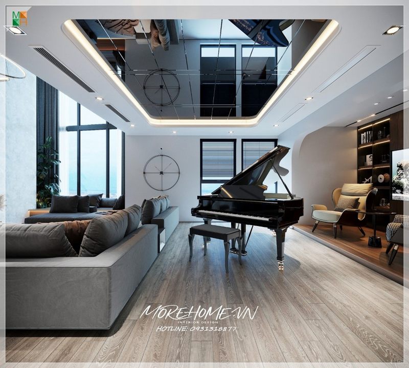 Một cây đàn piano được đặt tại không gian phòng khách có cùng tone màu bộ bàn ghế sofa óc chó là điểm nhấn độc đáo, thể hiện sự tinh tế và sáng tạo của KTS tạo nên một không gian phòng khách lý tưởng.