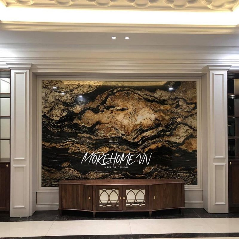 Bức vách tivi được ốp đá vân mây vàng mang đến sự sang trọng tuyệt đối cho phòng khách