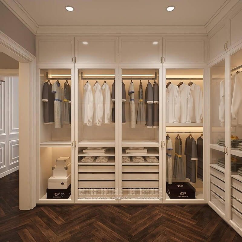Mẫu tủ quần áo cao cấp với thiết kế nhiều ngăn tủ khác nhau, những ngăn lớn để treo quần áo sử dụng cánh kính và những ngăn nhỏ để đồ gấp,… thì có thể sử dụng cánh gỗ
